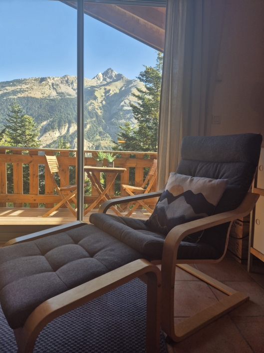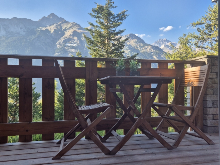 Vanuit de woonkamer heb je direct toegang tot een gezellig balkon. Op het balkon staan o.a. een houten tafeltje, twee stoeltjes en een houten bankje, ideaal voor een ochtendkoffie of een avondje ontspannen. Het balkon is voorzien van een afsluitbaar hekje, waardoor jonge kinderen veilig kunnen spelen zonder dat ze het balkon af kunnen lopen. In de hoek van het balkon staat een grote skilocker met slot, waar je je uitrusting veilig kunt opbergen na een dag op de pistes. In de zomer bevinden zich daar ook 2 parasols, in de winter liggen er meerdere sleetjes, waar de gasten uiteraard gebruik van mogen maken.