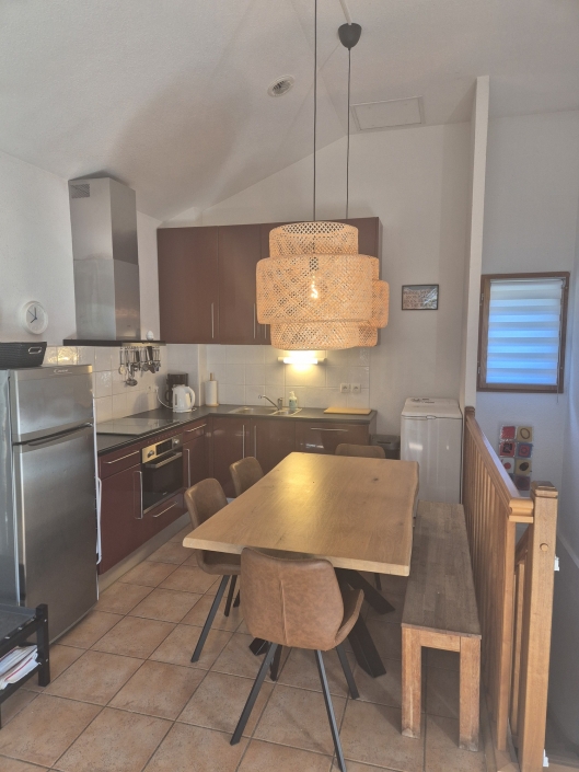 De keuken van Chalet 96 is modern en volledig uitgerust met alle gemakken die je thuis ook zou verwachten. Er is een elektrische kookplaat om heerlijke maaltijden te bereiden en een combimagnetron voor snel en gemakkelijk koken of opwarmen. Daarnaast beschikt de keuken over een afwasmachine, zodat je niet hoeft te worstelen met de afwas tijdens je vakantie, en een ruime koelkast om al je verse producten in op te slaan. Voor degenen die langer verblijven, of gewoon graag alles schoon en fris willen houden, is er ook een wasmachine beschikbaar. Kortom, ons chalet biedt een perfecte mix van comfort en gemak, waardoor je verblijf zo aangenaam mogelijk wordt.